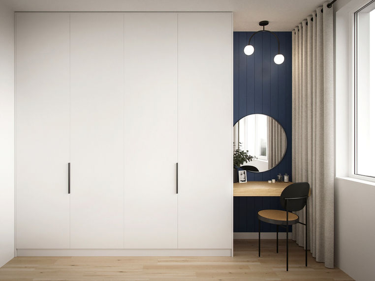 In diesem Projekt liegt der Fokus auf den Details, die uns besonders am Herzen liegen. Ein wunderschöner Wandspiegel, eine kleine Schminkecke mit dunkelblauer Verkleidung, ein Statement-Stuhl und stilvolle Wandlampen verleihen dem Raum Charakter. Unsere Aufgabe war es, einen luftigen und hellen Raum mit einem farbigen Akzent zu schaffen.