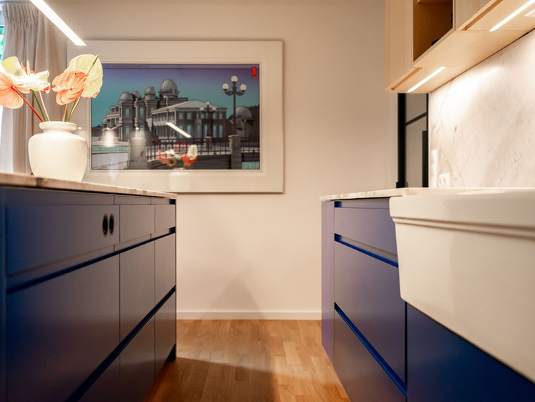 Die Decken wurden neu interpretiert, Elektroplanung und Beleuchtung angepasst, um eine harmonische Atmosphäre zu erzeugen. Als zentrale Elemente prägen eine markante Küche mit abgerundeten Kanten und Natursteinflächen sowie eine maßgefertigte Sitzbank mit integriertem Stauraum das Interieur. Ein begehbarer Kleiderschrank zonierte das Schlafzimmer neu in zwei intimere Bereiche, während Lofttüren zusätzlich Licht und Offenheit in die Räume brachten.
